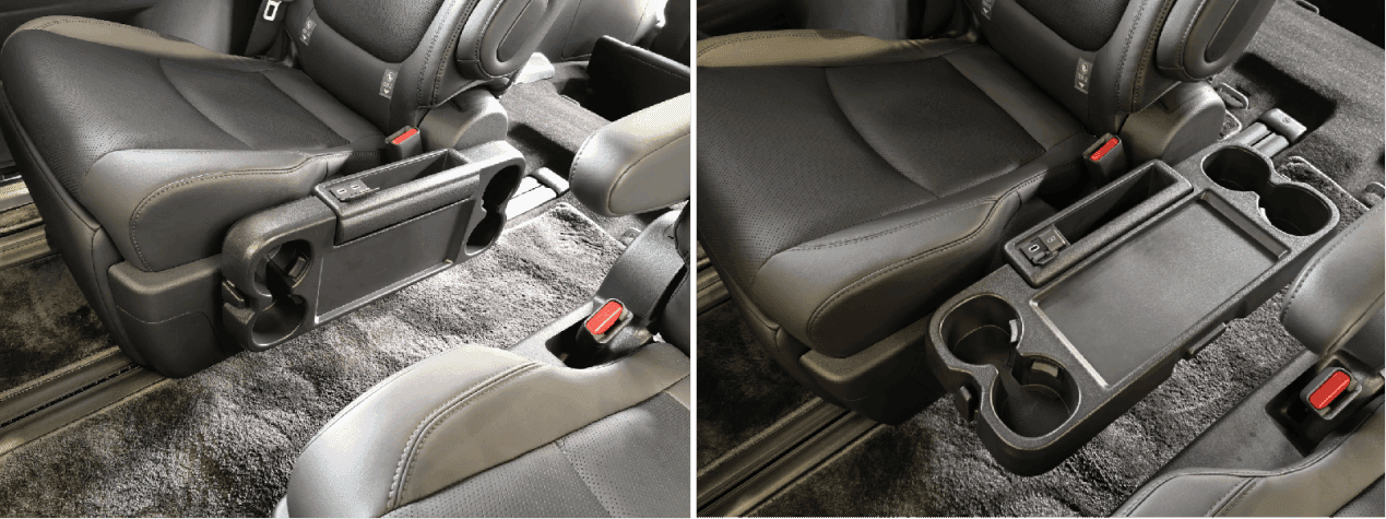 赛那的小桌板并没有放在前排椅背,而是给二排座椅侧面安排了一个折叠置物板,轻轻按住下方的小机关向上翻,就能放平固定。这种设计,也没有挤占中间过道空间。置物板除了杯托,旁边还有两个type-c充电口,二排乘客、三排乘客需要给手机、平板充电,它都能兼顾到。