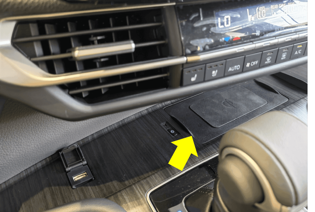 中央扶手的核心区域留给了几个传统操作,除了机械挡把以及驾驶模式切换,其它区域就是杯托、储物槽。无线充电的区域位于中控台下方,有点隐蔽。