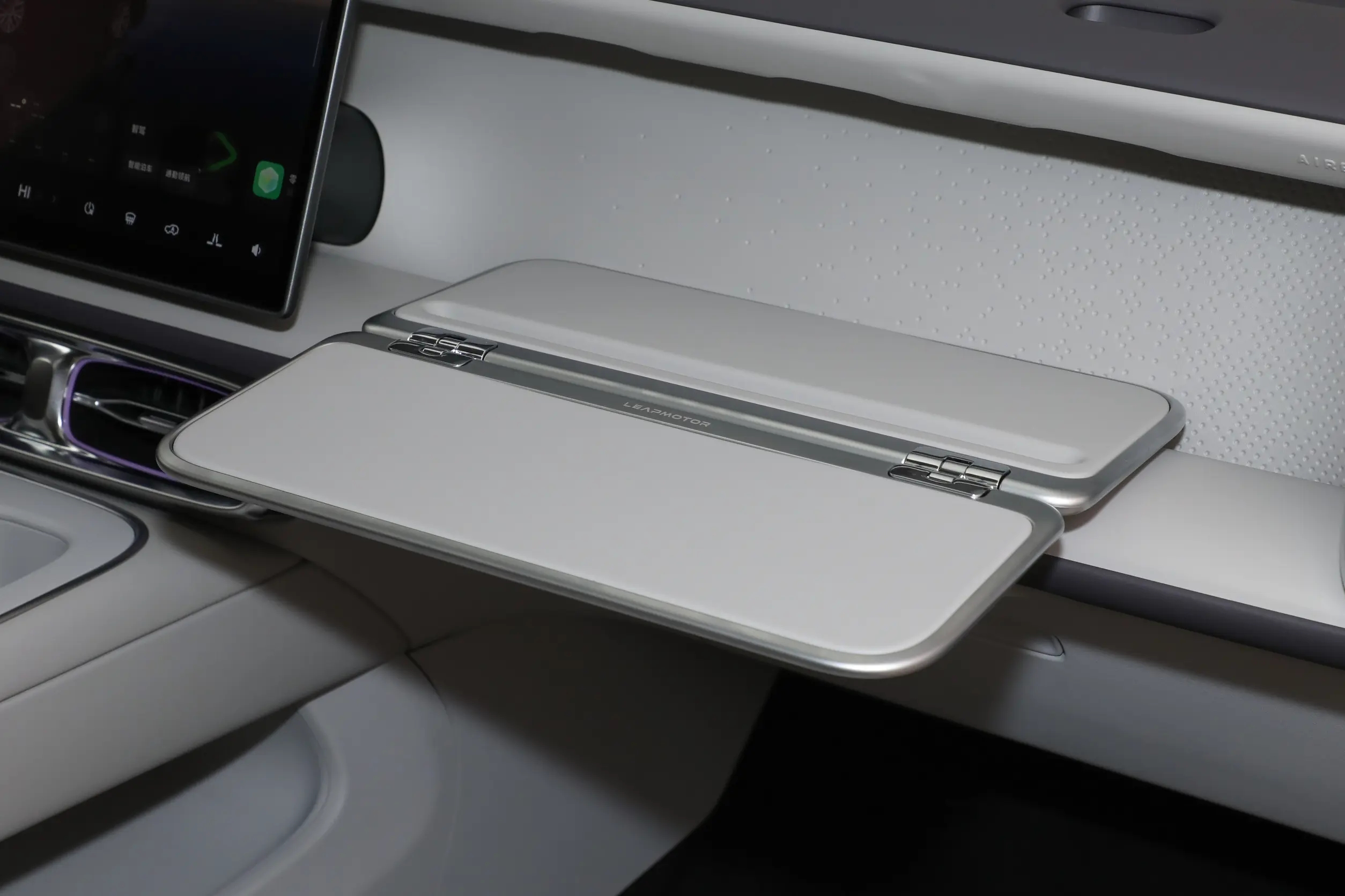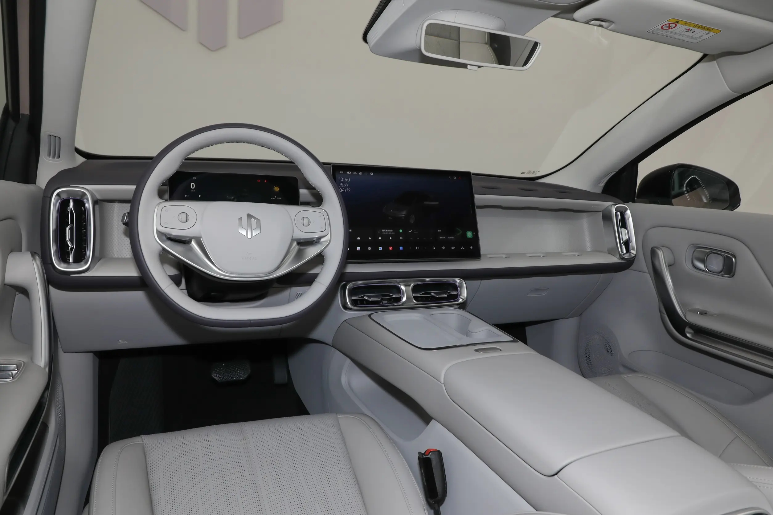 内饰方面,B01车型与B10同样有着非常相似的特点。中控台采用了双色拼接设计,方向盘也是双色真皮包裹,而且配备了一块8英寸全液晶仪表以及一块14.6英寸高清触控屏,搭载高通8295车规级芯片以及8650自动驾驶专用芯片,提供智能化的信息交互界面以及便捷的操作体验。此外,副驾前方是一块多孔装饰面板,车上人员可以借助折叠桌板或者手机支架之类的配件来扩充车内的空间利用程度,这种以开放式的布局作为设计的核心,巧妙地把好几个储物单元结合在一起,进而营造出一种既有用又整齐的视觉体验。