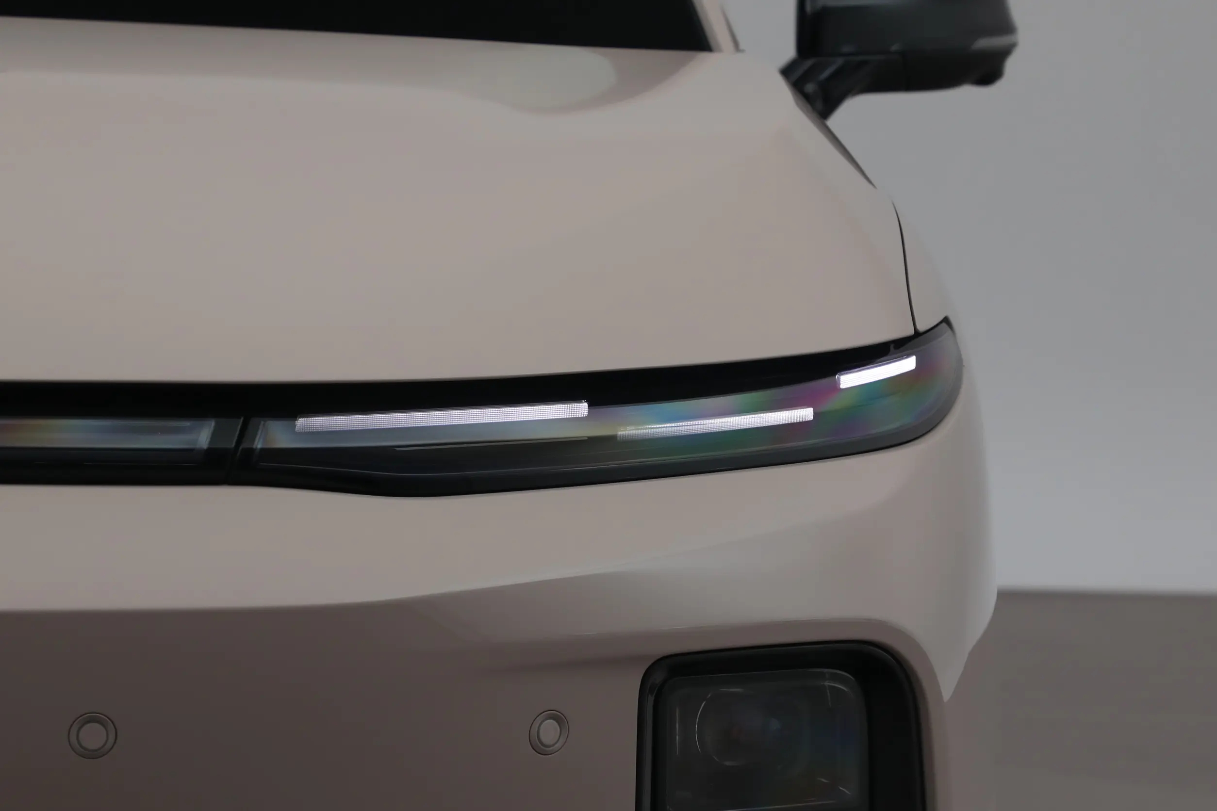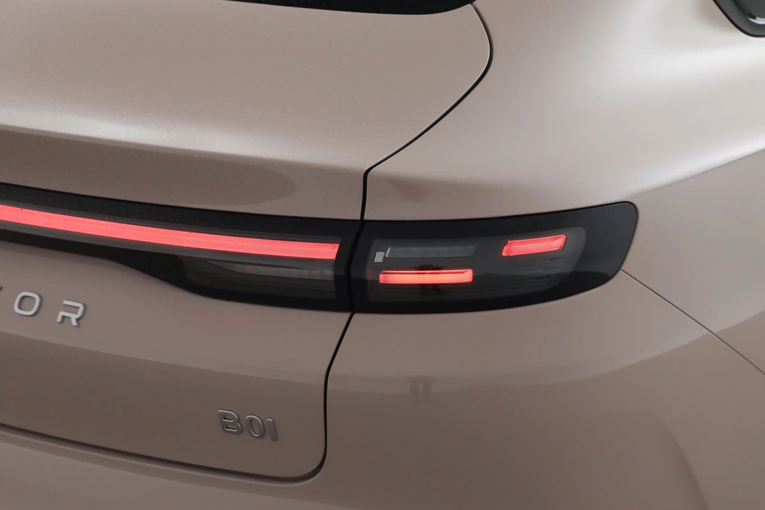 从外观来看,零跑B01跟B10有类似的设计思路和美感风格。前脸部分使用了分体式大灯,上面是三道横排LED灯带占据着主导地位,这种设计呈现出简约时尚之美,贯穿三段式灯带无疑是零跑的家族特色,辨识度拉满。车身侧面线条流畅动感,尤其是C柱,设置了一个比较大的三角窗,营造出协调一体的美感。