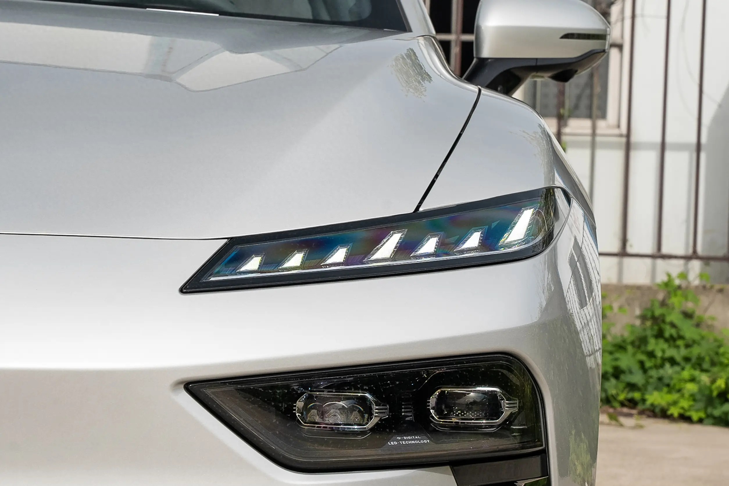 在外观设计方面,eπ007采用的是宽体且低矮的流线形设计。车头的设计非常简约,封闭式格栅几乎没有多余的元素,两侧分体式大灯组辨识度较高,内部光源布局类似矩阵式,看起来很有档次。车身侧面也是亮点所在,无框车门以及能够电动收起的隐藏式门把手,这些元素融合在一起,塑造出一种极具冲击力的运动轿跑形象。车尾的设计和车头类似,贯穿式尾灯拉宽了尾部的视觉宽度,相较于比亚迪汉,eπ007的车尾看起来更协调一些。