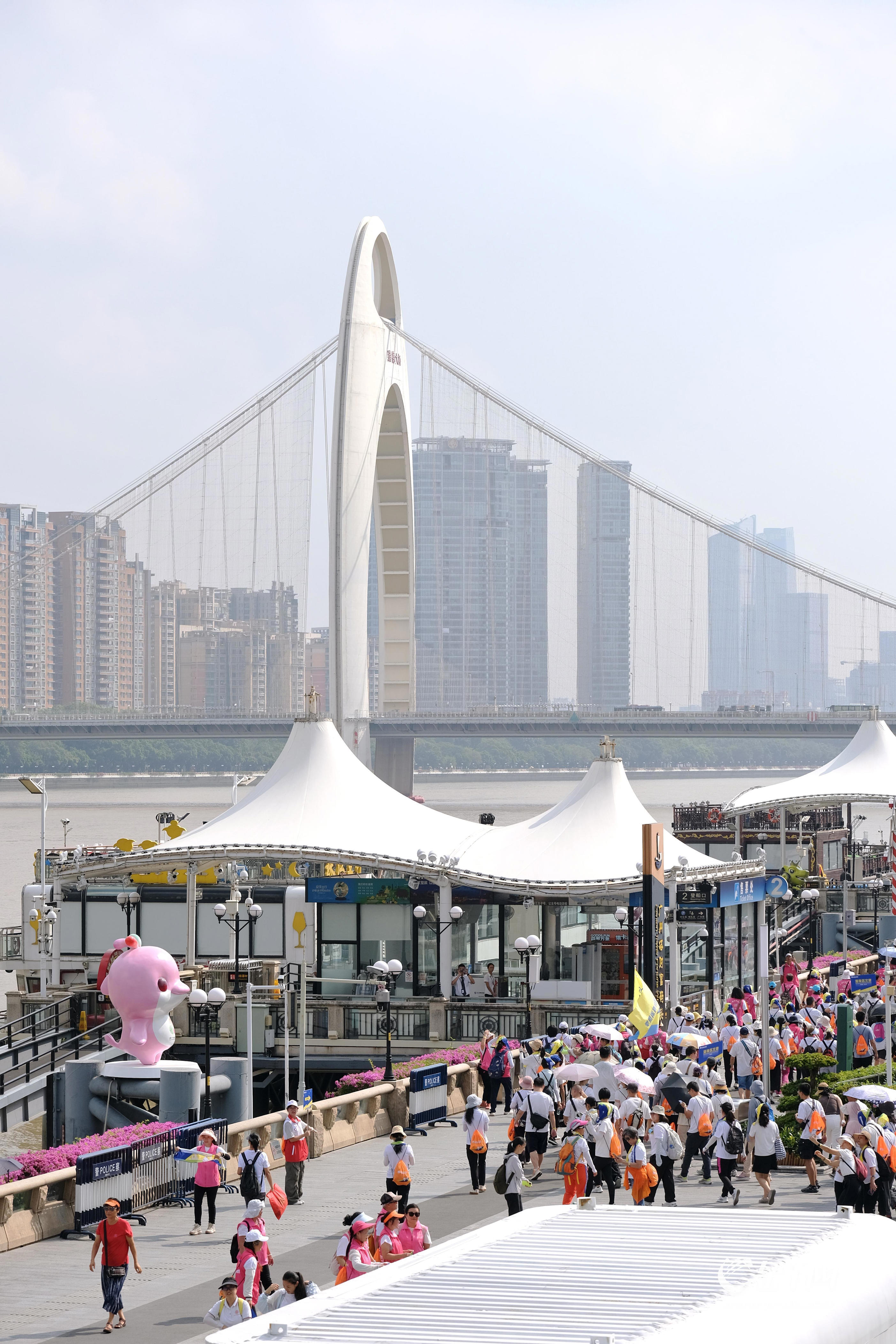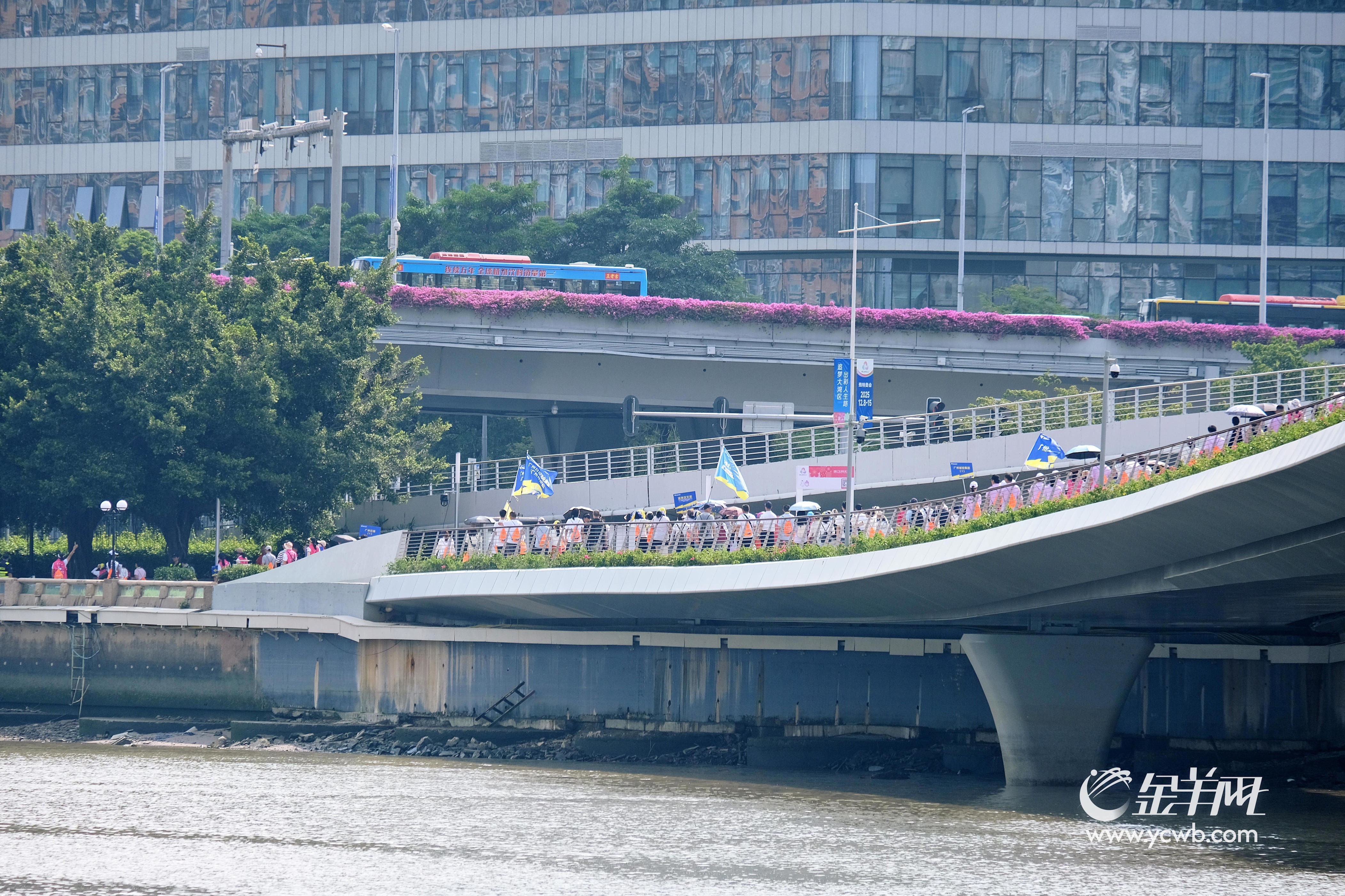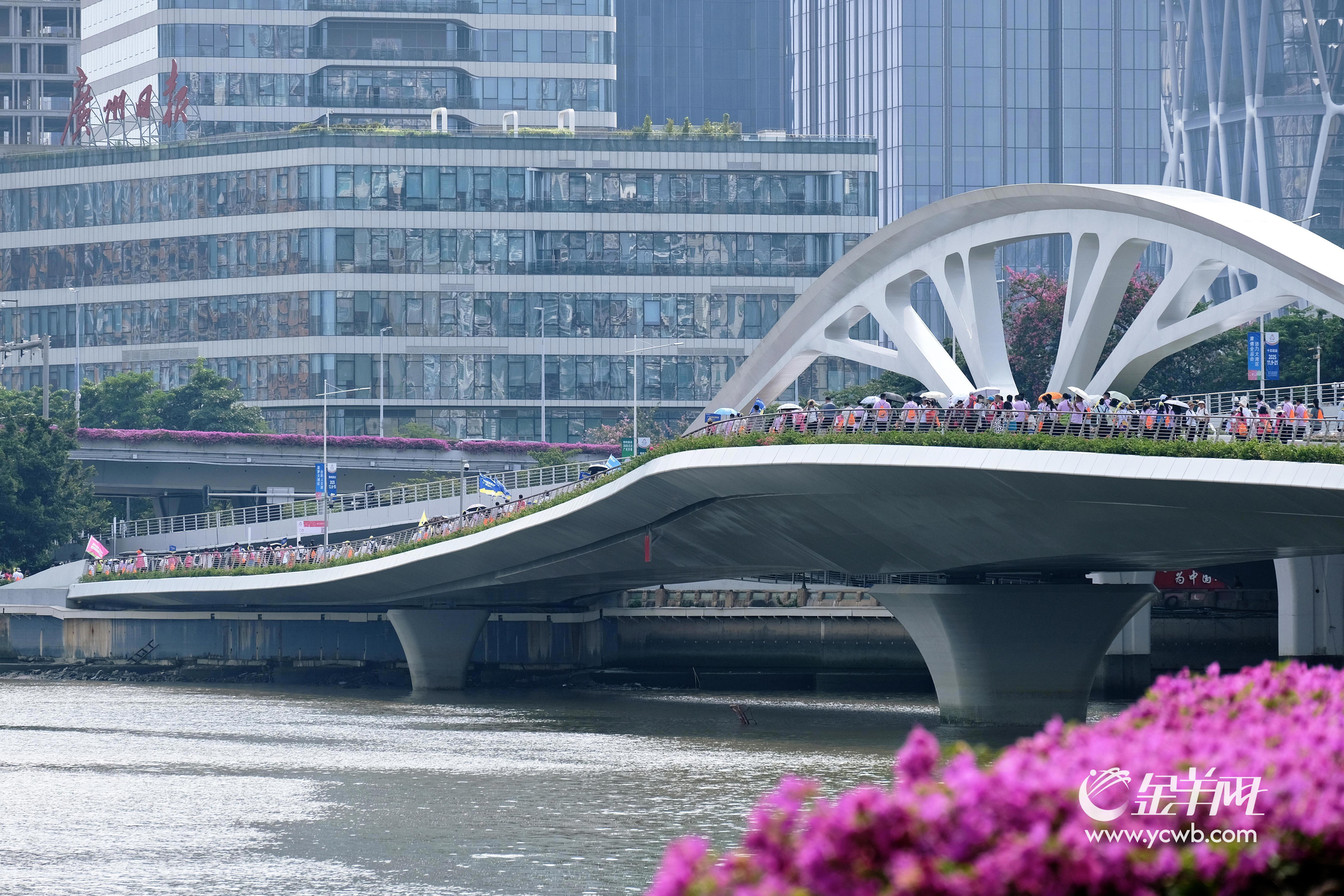 琶洲是近年来广州冉冉升起的新兴商务区,人工智能、数字经济、会展经济等产业在此聚集,不断为广州发展注入新动力。11日徒步活动的终点,设在琶洲西区滨江立体人行桥,这也是琶洲西区滨江立体人行桥首次对公众开放。
